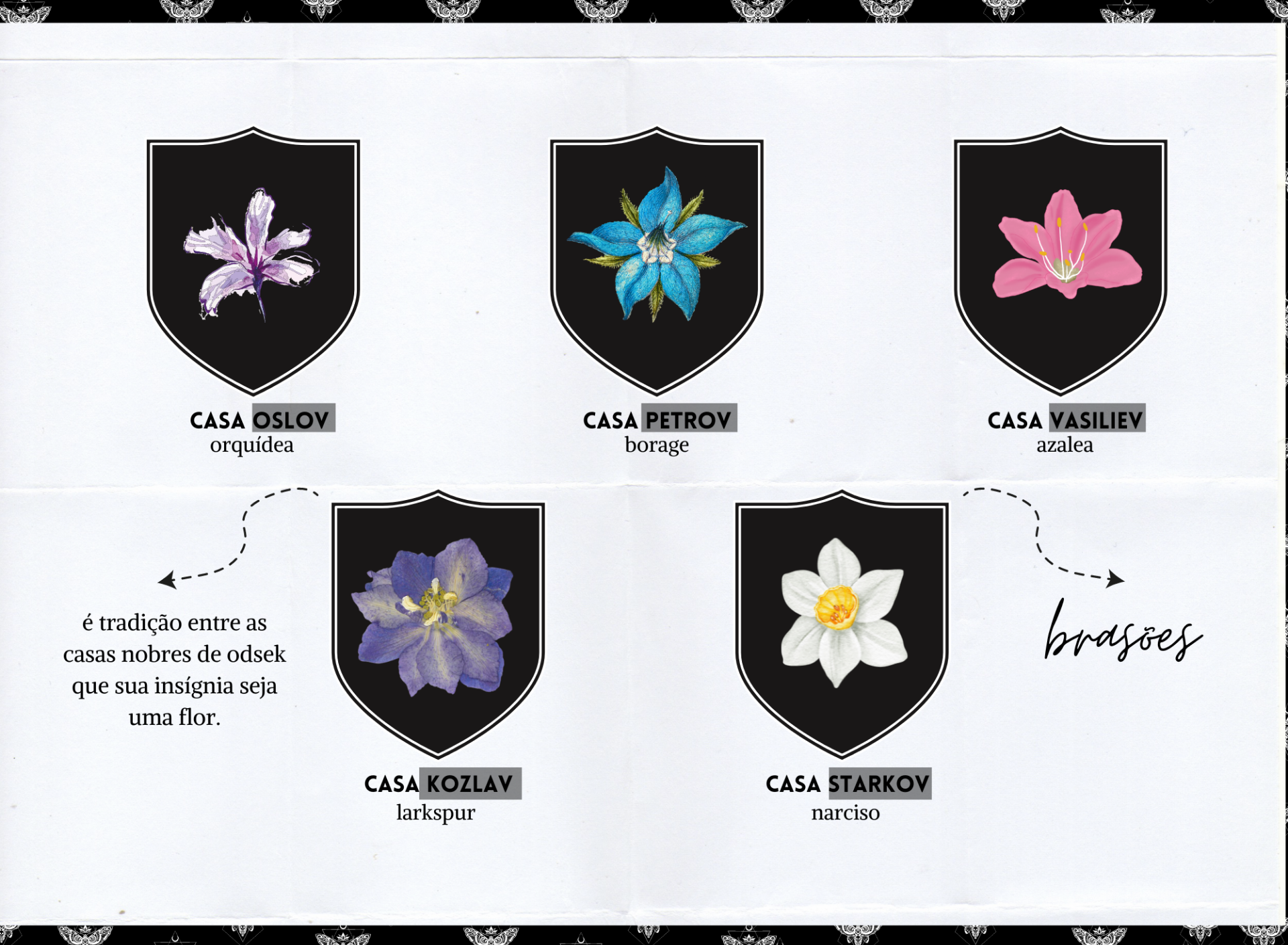 Além de ocupar territórios delimitados e aderirem à tradição de se representarem por flores específicas, as casas de Odsek tendem a certas ocupações e especializações, afinal, não é apenas nas assembleias ou na posição de Lorde ou Lady que um deve servir sua casa. São as cinco famílias: